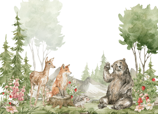 Woodland Animals Mural Wallpaper - Bear, Deer, and Fox Watercolor