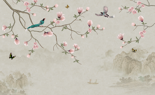 Oriental Magnolia Blossom, Bird, and Mountain Mural