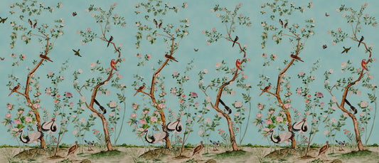 Chinoiserie Elegance: Vintage-Inspired Wallpaper with Trees, Flowers, and Birds on Light Blue