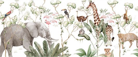 Botanical Safari Border Mural Wallpaper - Giraffe, Deer, and Flamingo Watercolor