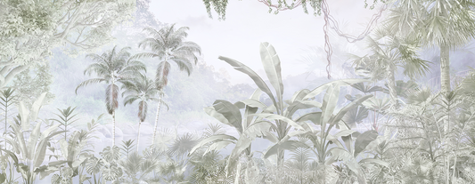 Ethereal Misty Tropical Jungle Mural - Pale Gray and Green