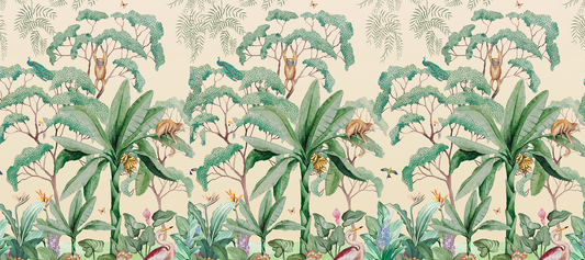 Tropical Jungle Border Mural Wallpaper with Monkeys and Herons - Watercolor