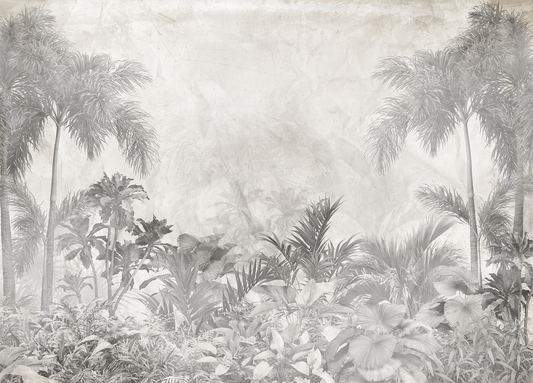Monochromatic Tropical Jungle Mural Wallpaper - Pale Gray Vintage