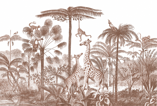 African Safari Engraving Mural Wallpaper - Giraffes and Monkeys Monochrome