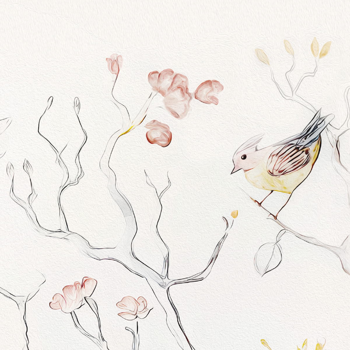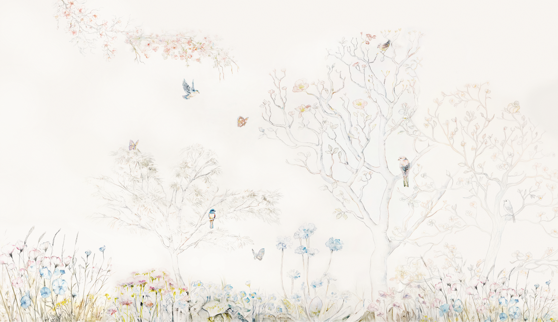 Enchanted Forest Watercolor Mural - Delicate Birds & Blooming Trees