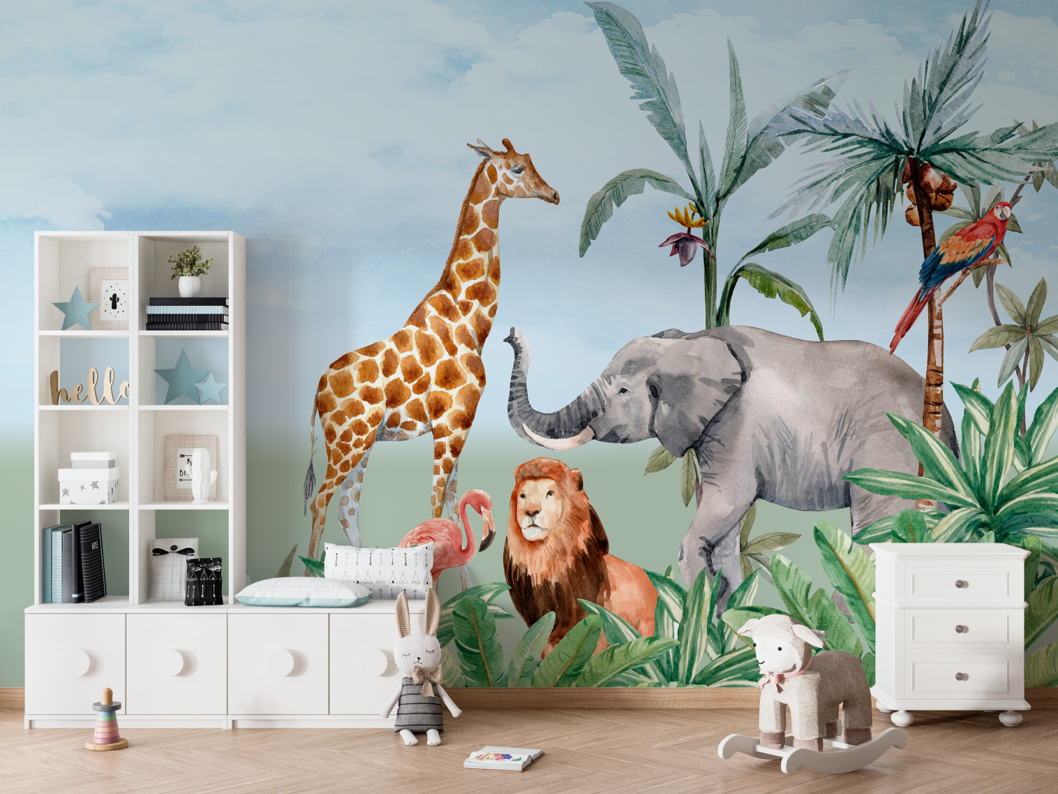 Detailed Watercolor Safari Mural featuring Giraffe, Lion, Elephant, Toucan, and Flamingo. Vibrant and cheerful design, perfect for jungle or safari-themed nurseries, kids' rooms, and play areas.