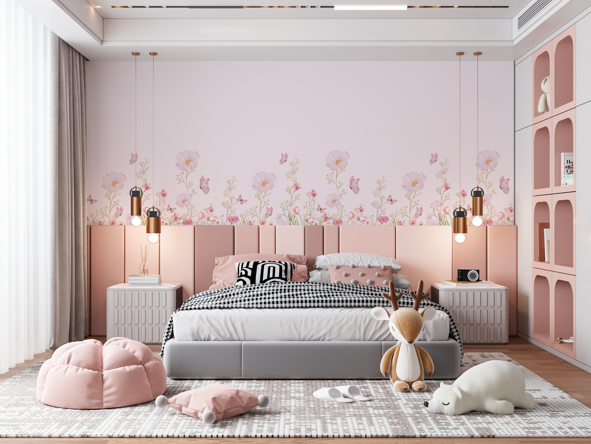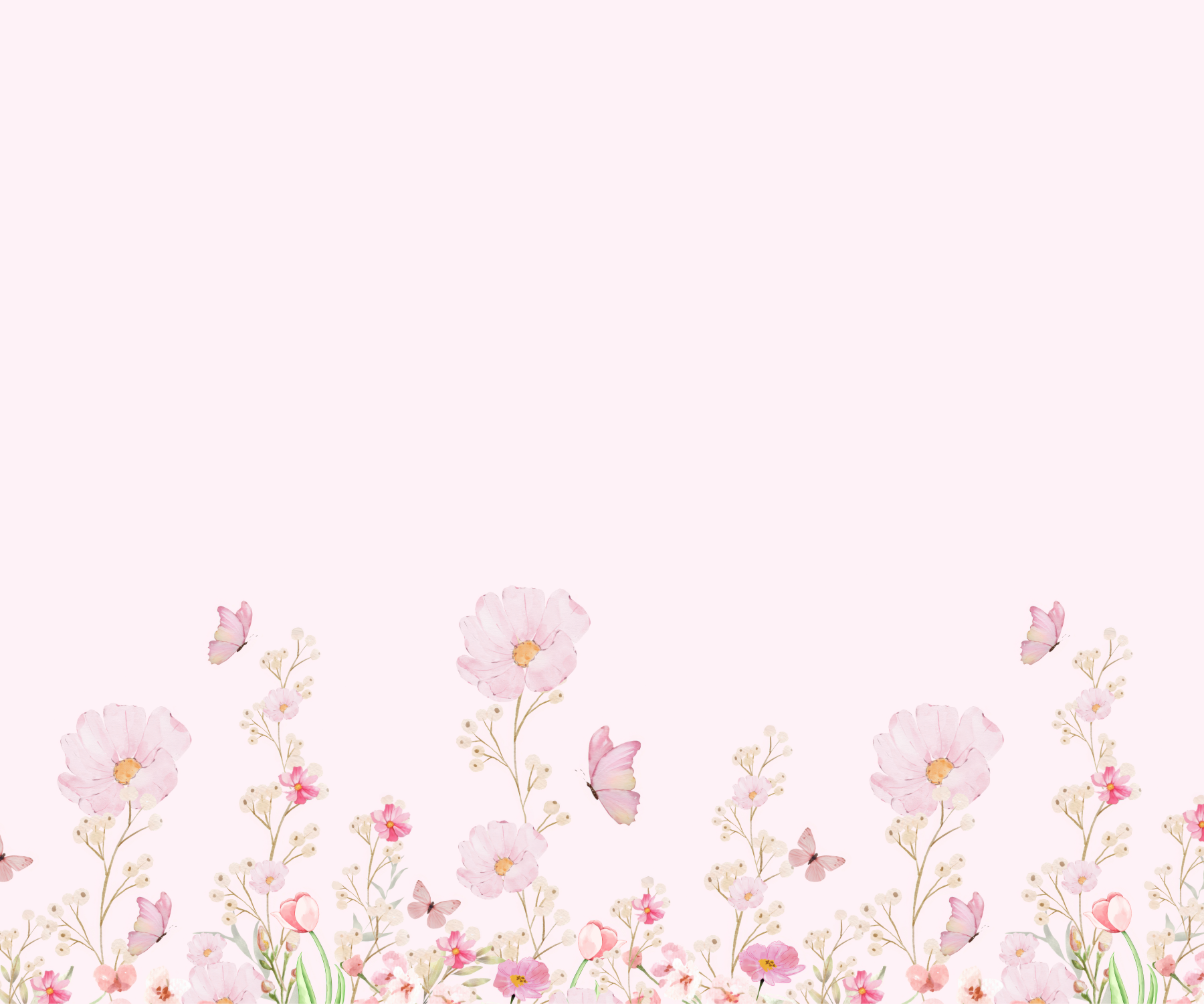 Create a charming and serene space with this delightful wall mural, featuring a beautiful border of delicate pink flowers and fluttering butterflies against a soft pink background. Its gentle, whimsical design brings a touch of natural beauty and sweet enchantment, perfect for nurseries or bedrooms.