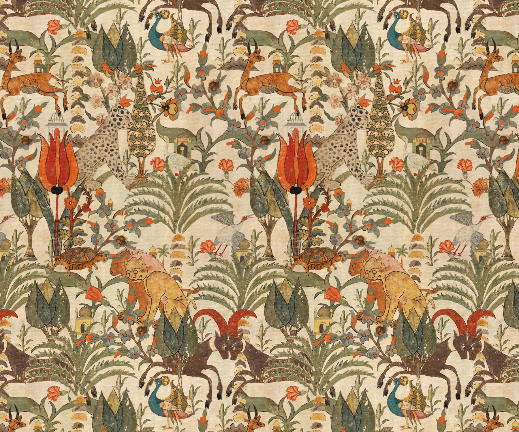 Adorn your space with this rich and intricate vintage-inspired mural, featuring a repeating tapestry-like pattern of Persian wildlife—including deer, leopards, and peacocks—interspersed with lush florals and stylized motifs. Its vibrant yet earthy palette and detailed design bring a touch of exotic elegance and historical grandeur to any sophisticated interior.