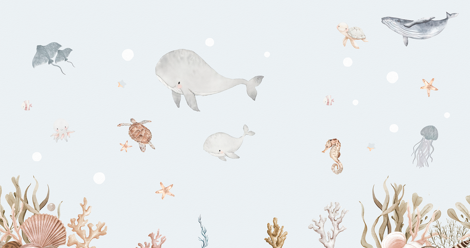 Charming Watercolor Sea Life Mural featuring Whales, Seahorses, Turtles, and Corals. Soft blue and beige pastel tones, perfect for nurseries, kids' rooms, and serene nautical decor.