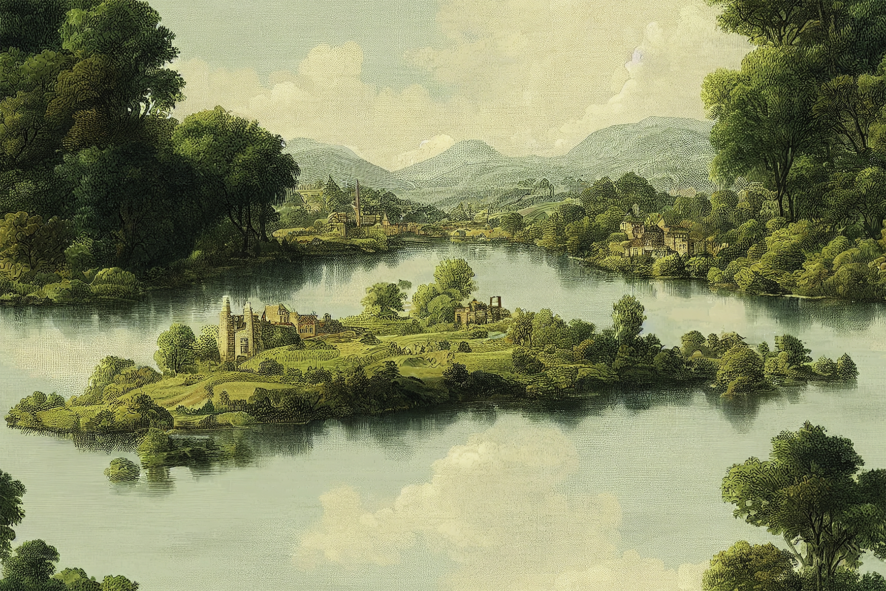 Classic Romantic Landscape Mural Wallpaper - Lake and Island Vintage Style