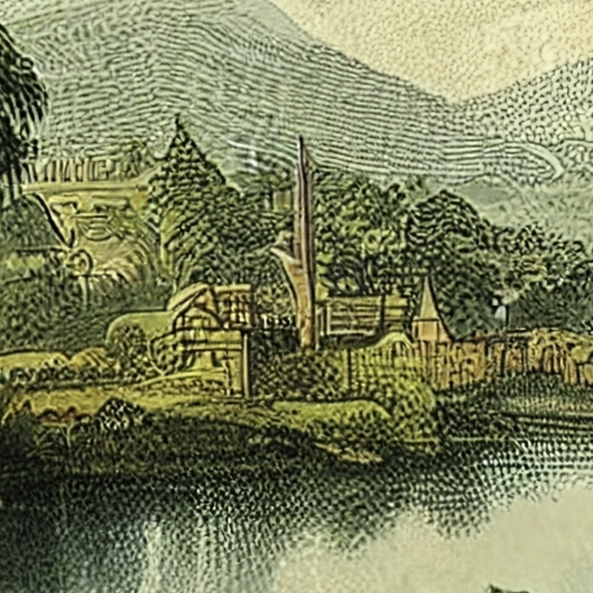 Stunning Romantic Landscape Mural featuring a lake, island, and ruins in a classic vintage painting style. Saturated emerald green and sky blue tones. Ideal for colonial decor or elegant libraries.
