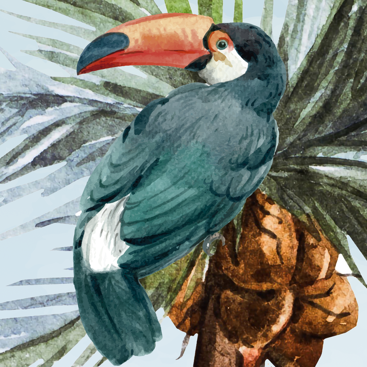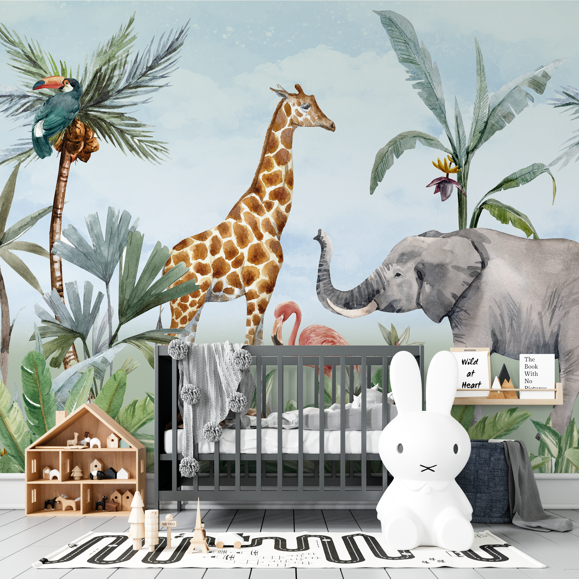 Vibrant Watercolor Safari Mural featuring Giraffe, Elephant, Flamingo, and Toucan. Bright colors and cheerful tropical design, perfect for nurseries, kids' rooms, and playrooms.
