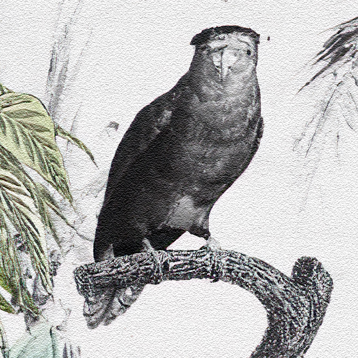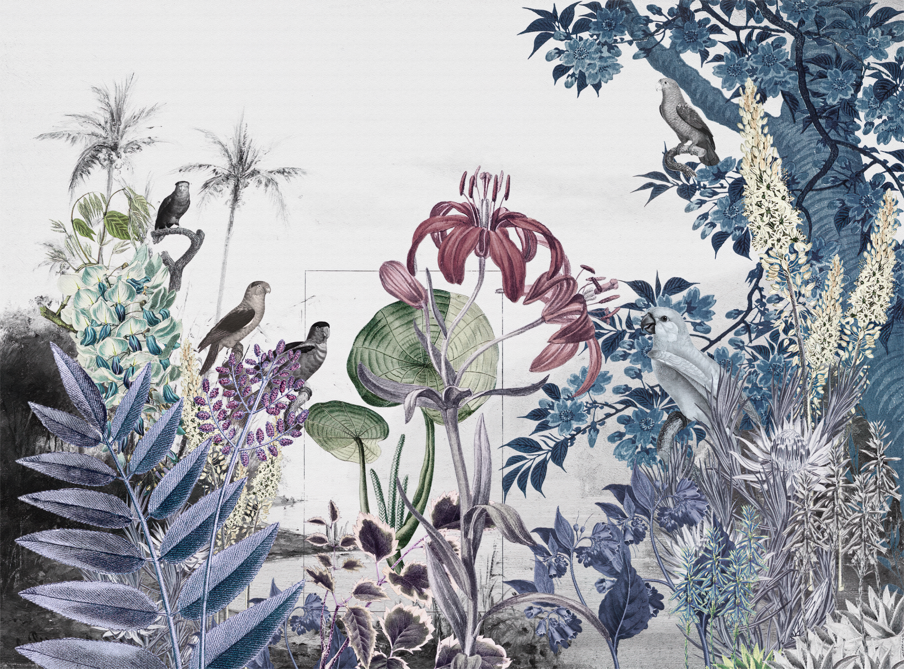 Dramatic Tropical Garden Mural featuring birds, exotic flowers, and palms. Intense color combination (blue, purple, burgundy) over a textured background. Ideal for maximalist or high-impact decor.