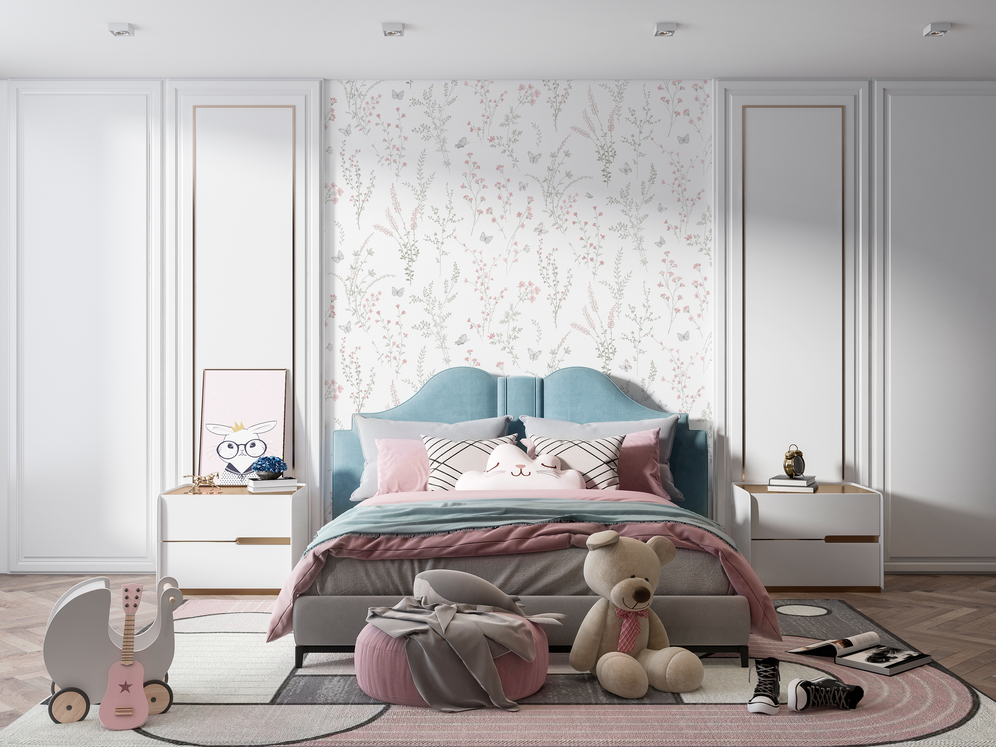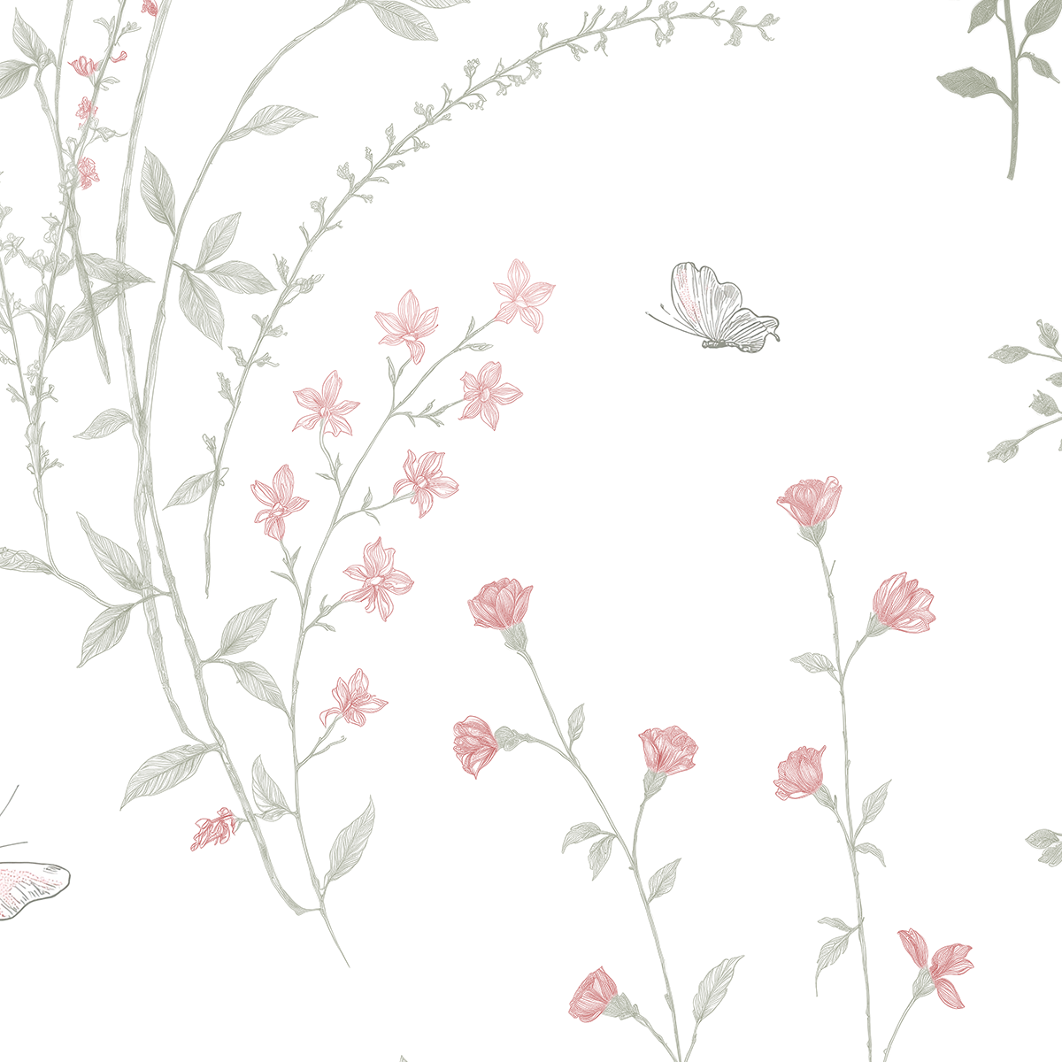 Adorn your walls with this charming and serene mural, featuring a delicate repeating pattern of wildflowers in soft pinks and greens, interspersed with fluttering butterflies. Its subtle, romantic design creates a peaceful and inviting atmosphere, perfect for a tranquil bedroom, a charming nursery, or a light-filled living space.