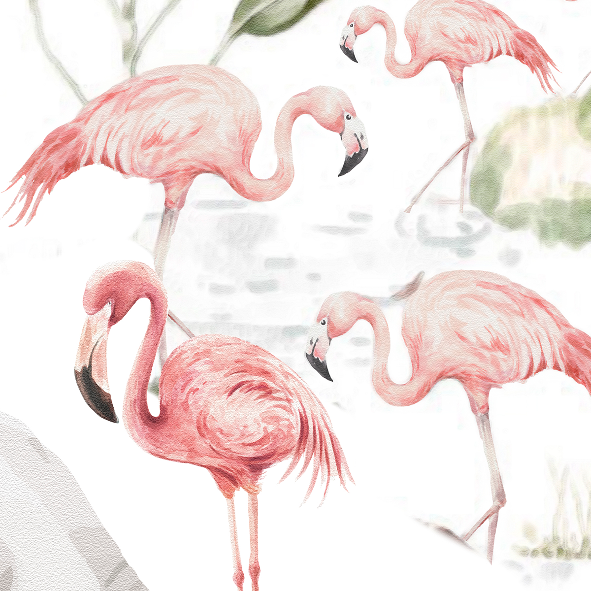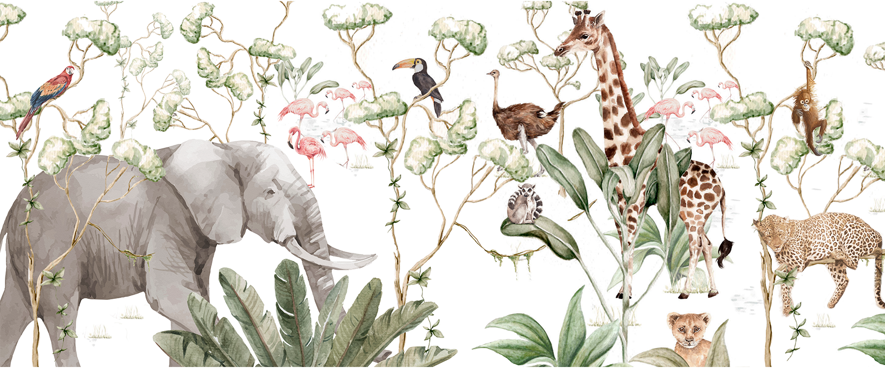 Detailed Watercolor Safari Mural featuring Giraffe, Elephant, Leopard, Ostrich, and Flamingos. Lush and cheerful design, perfect for African-themed nurseries, kids' rooms, and play areas.