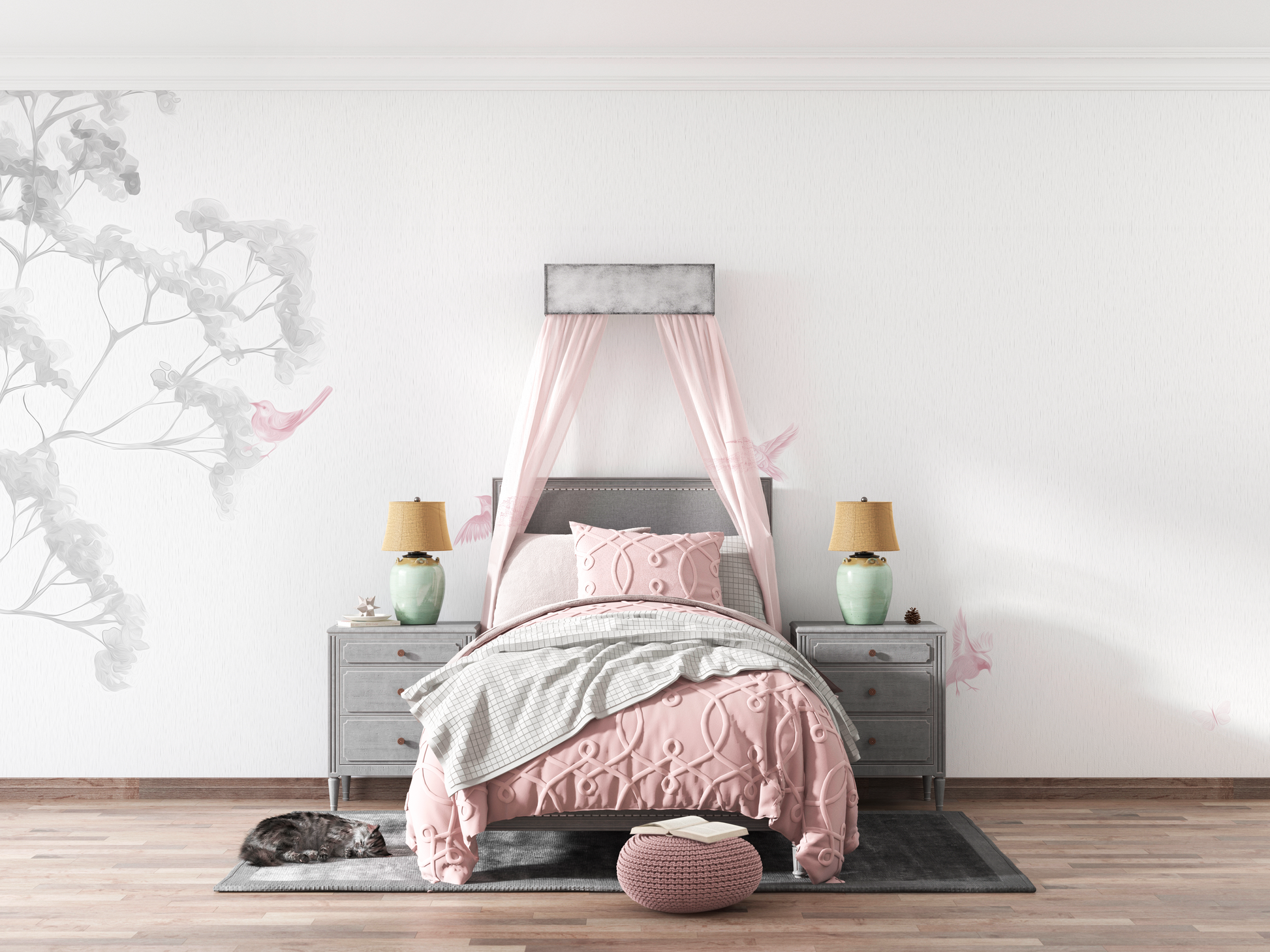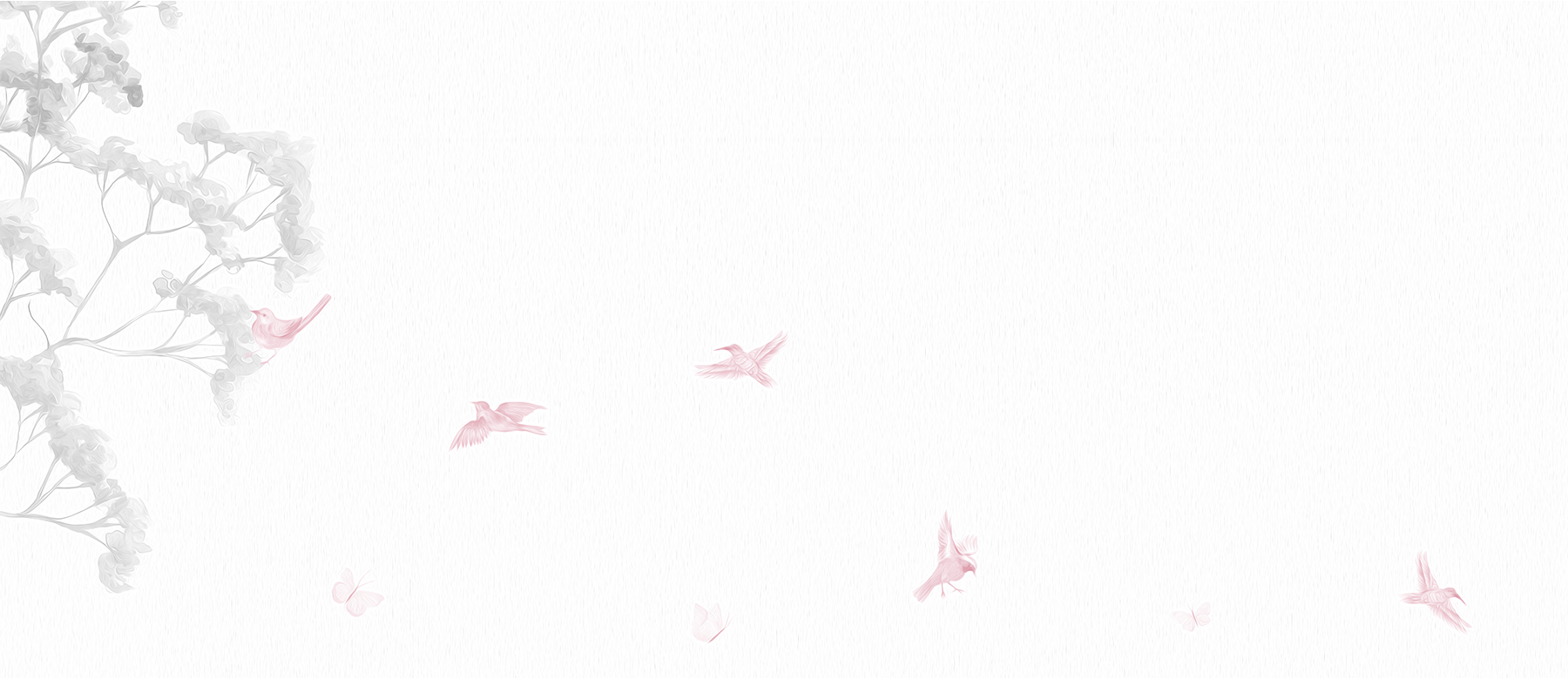 Minimalist and ethereal mural design featuring silhouettes of birds, butterflies, and tree branches in very soft tones of white, gray, and pale pink. Ideal for bedrooms, spas, or Scandinavian decor.