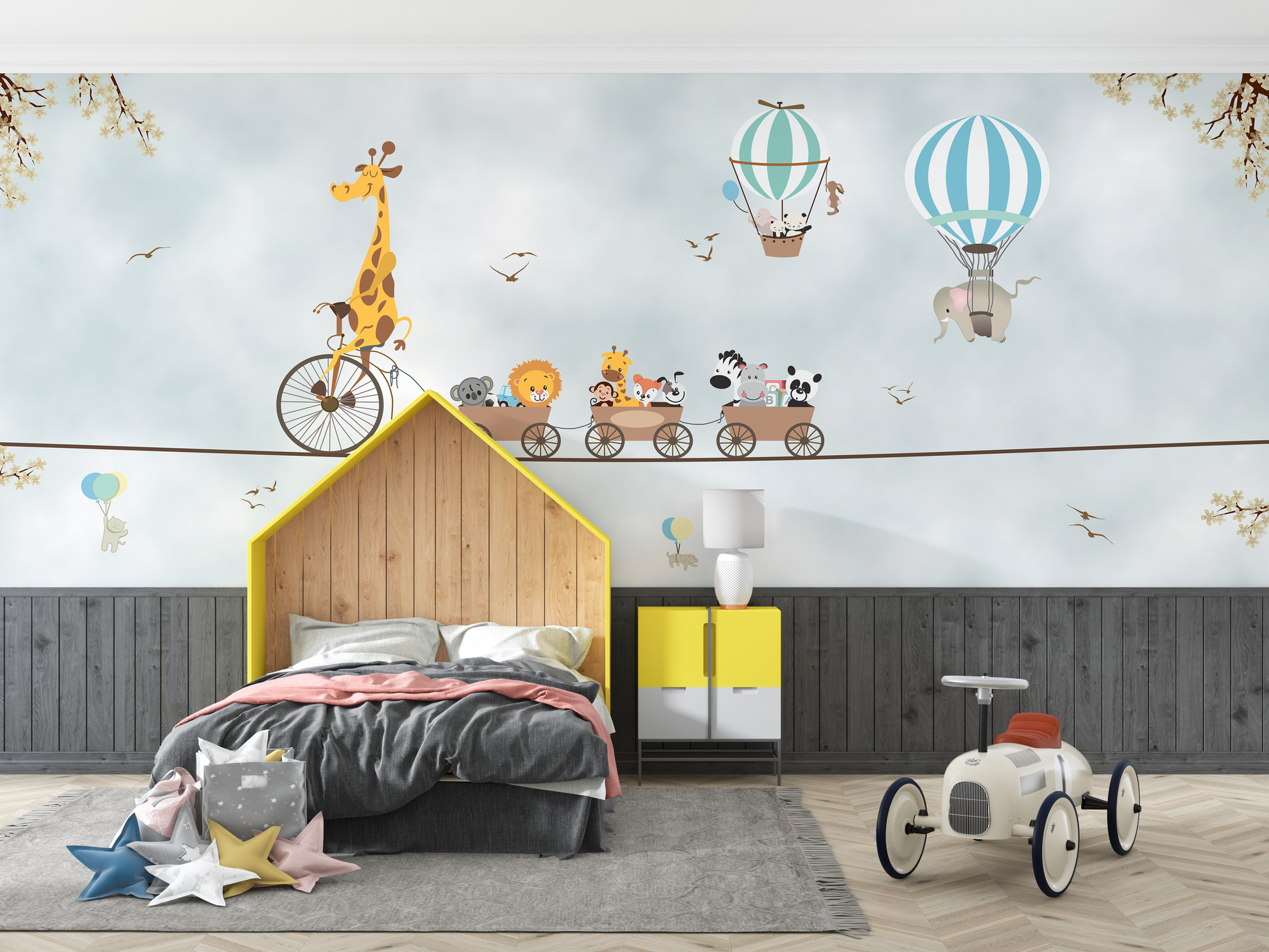 Kids Safari Mural featuring a Giraffe on a bicycle pulling a train with a Lion, Zebra, and other animals. Hot air balloons and clear blue sky, perfect for nurseries or toddlers' rooms.