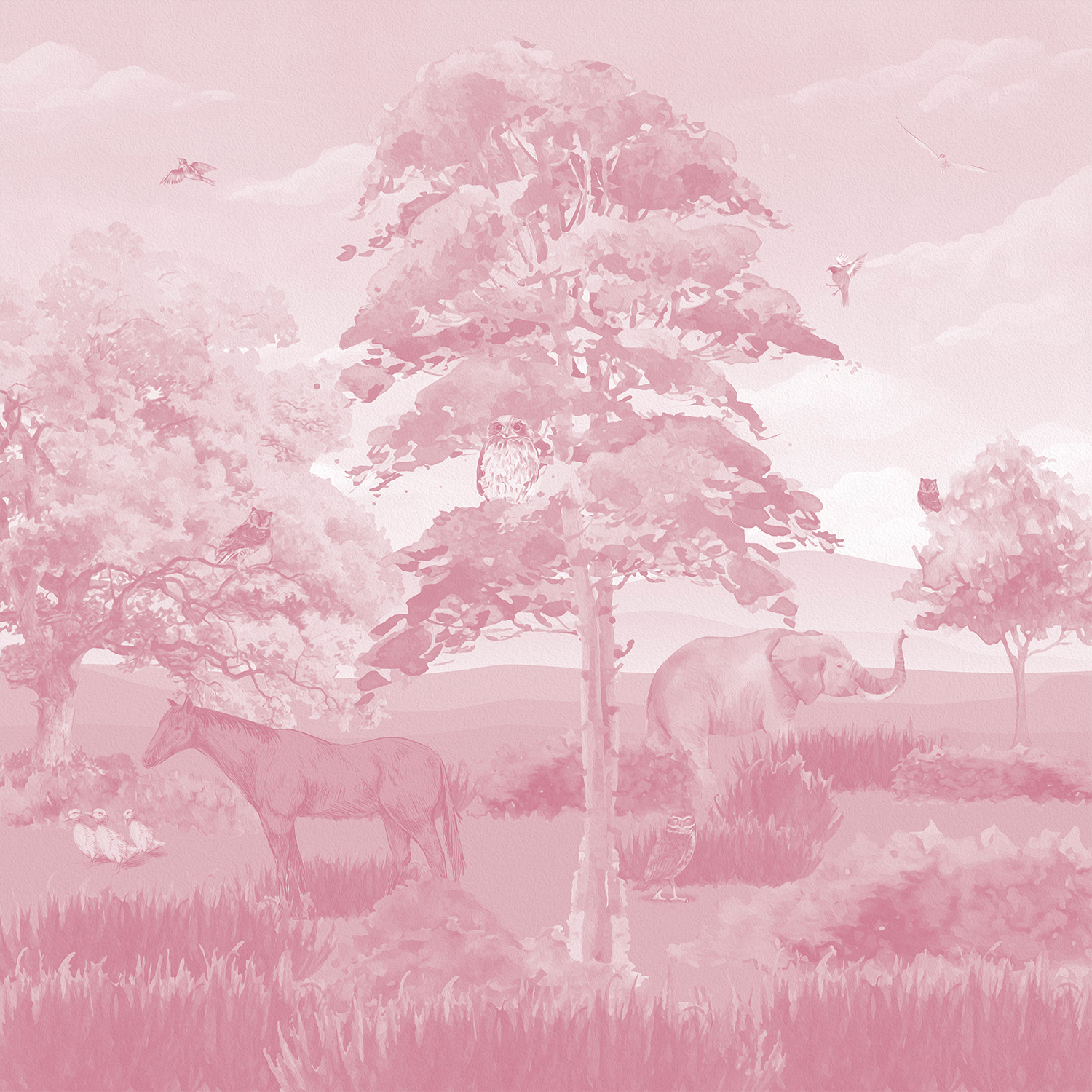 Create a unique and ethereal statement with this charming, full-scale landscape mural rendered entirely in shades of soft pink. The design features a serene forest and meadow scene, complete with trees, an elephant, a horse, and various birds and owls. Its monochromatic watercolor wash effect adds a playful yet sophisticated depth and texture, making it a dreamy backdrop for a modern nursery, a girls' bedroom, or a chic accent wall.