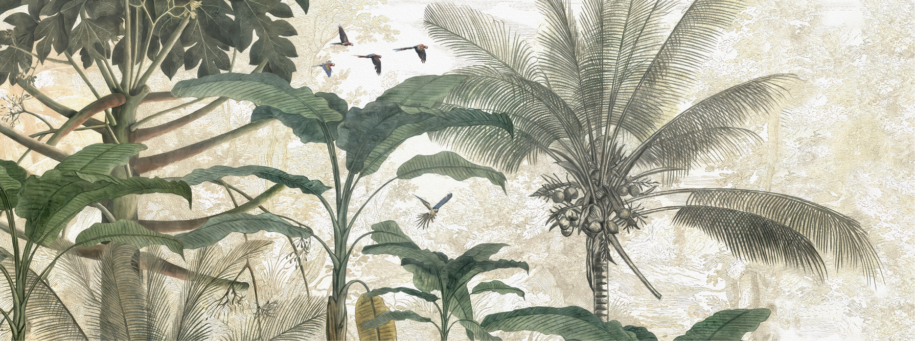 Immerse your space in the lush beauty of the tropics with our Tropical Jungle Paradise wall mural. This captivating wallpaper features a rich blend of vintage botanical illustrations, showcasing broad banana leaves, elegant palm trees laden with coconuts, and a flock of exotic birds in flight, all set against a textured, light-toned background. Perfect for creating a stunning accent wall in a living room, dining area, or master bedroom, this mural transforms any space into a vibrant and adventurous oasis.