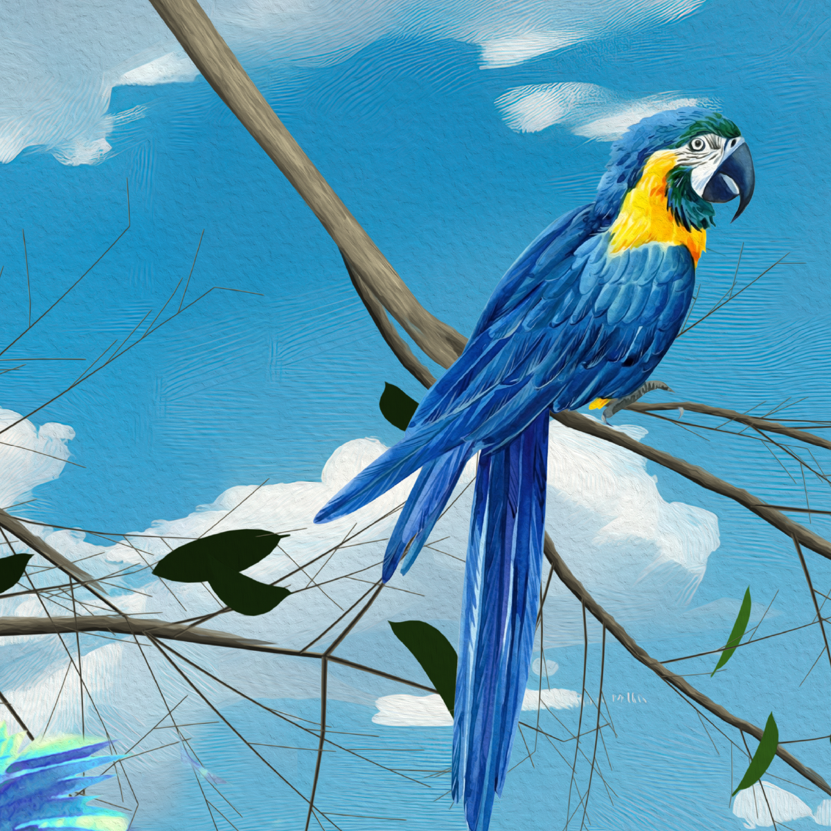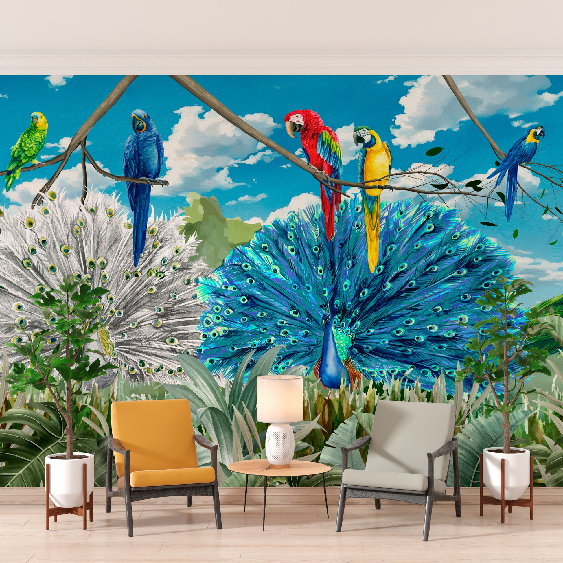 Transform your room into an exotic spectacle with this vibrant mural, showcasing magnificent peacocks with fanned tails and colorful parrots perched on branches under a bright blue sky. Its bold, lively design brings a breathtaking touch of tropical splendor and artistic flair to any space.